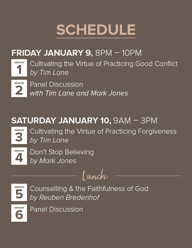 This conference will explore how we can give wise and loving care to each other as fellow pilgrims. Dr. Tim Lane will address us with Scriptural truth and practical guidance regarding conflict and forgiveness. Dr. Mark Jones will speak on the theme of “the Pilgrim’s Regress” and how believers can guard against backsliding. Dr. Reuben Bredenhof will focus on the centrality of God’s faithfulness in our spiritual care. There will also be time for Q&As, two panel discussions, and excellent food and fellowship.