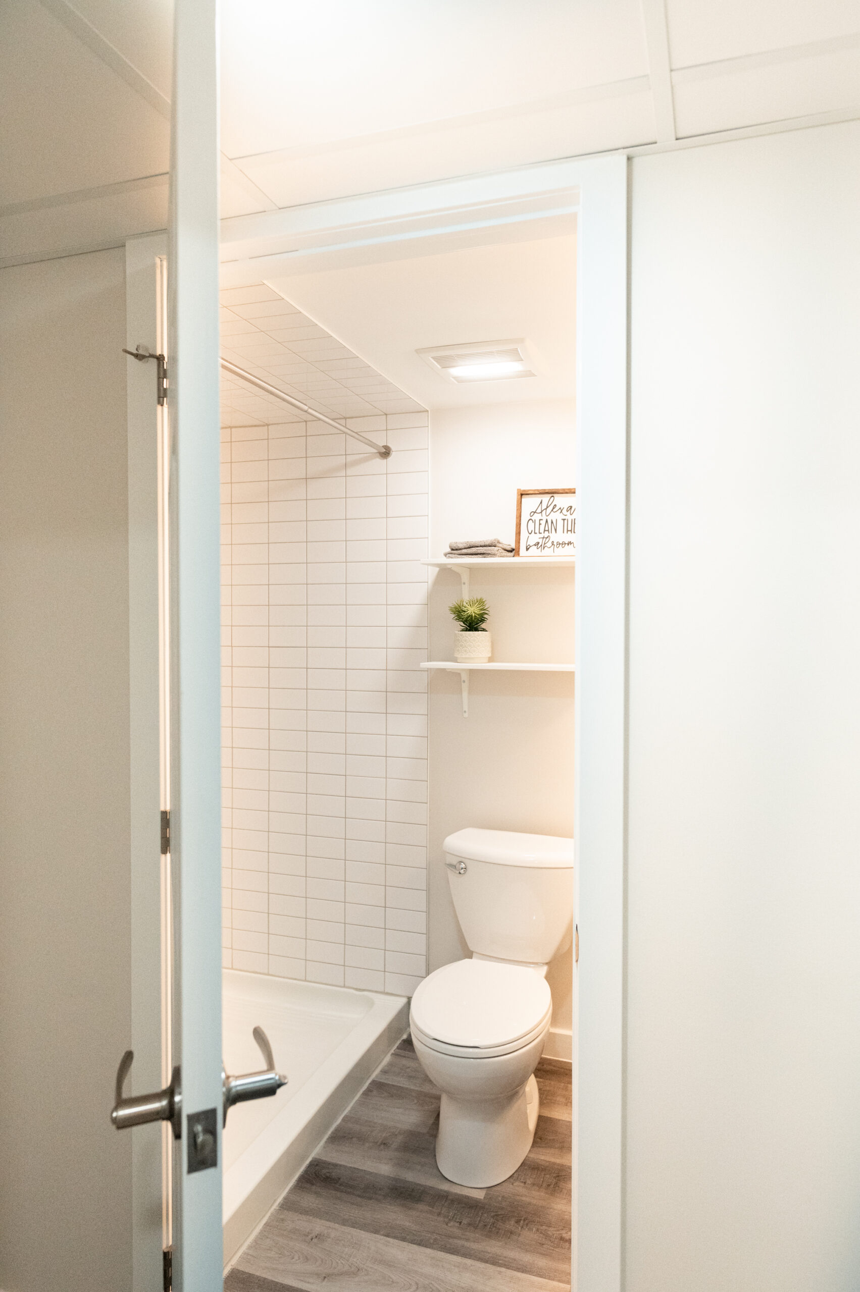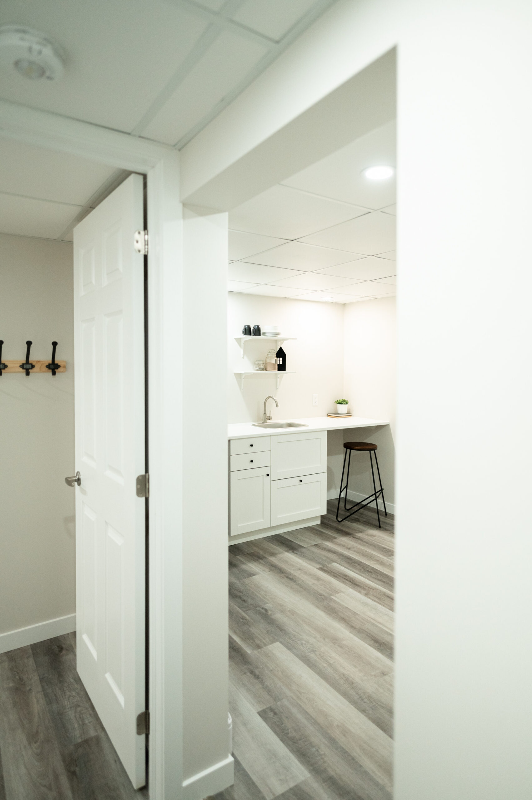 Lovely 1 bedroom suite with closet, kitchenette, and sitting area. Full bath with spacious shower. Currently furnished with double bed and couch. Additional photos available.